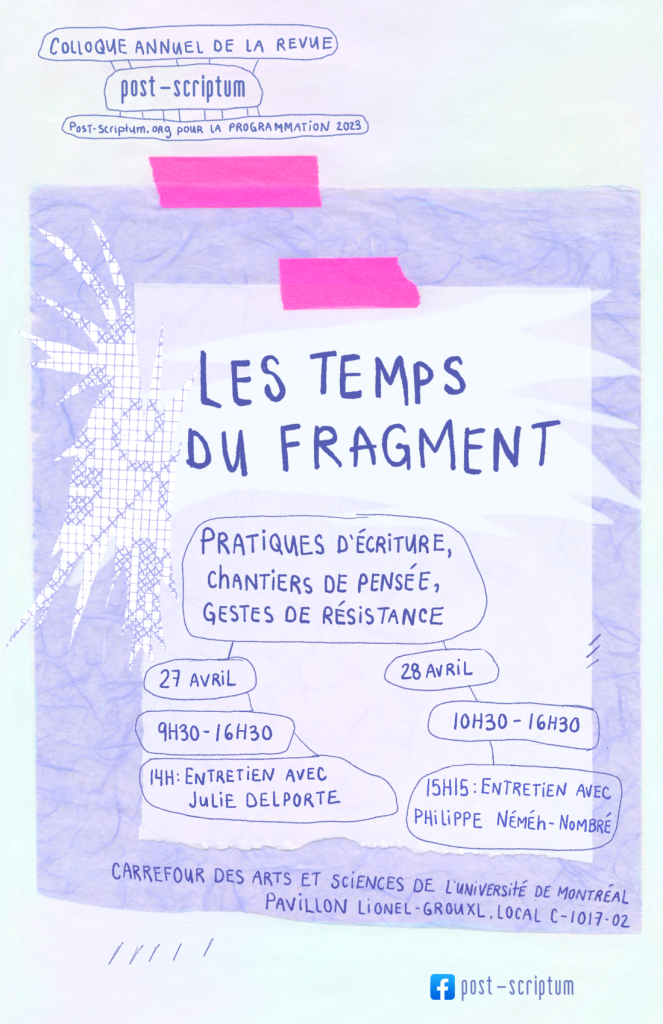 Appel à communications – Les temps du fragment : pratiques d’écriture, chantiers de pensée, gestes de résistance Colloque annuel de la revue Post-Scriptum 3 novembre 2022